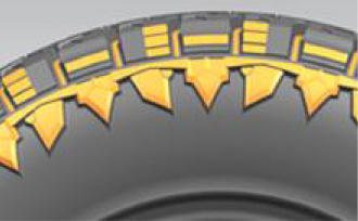 外觀富有立體感,更加強壯,為胎側提供有效防護,提高耐撞耐刺性能;花紋溝底部增加彈石子結構,保證花紋抓地力 。